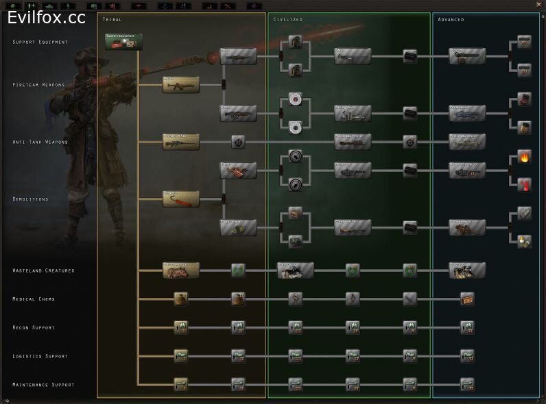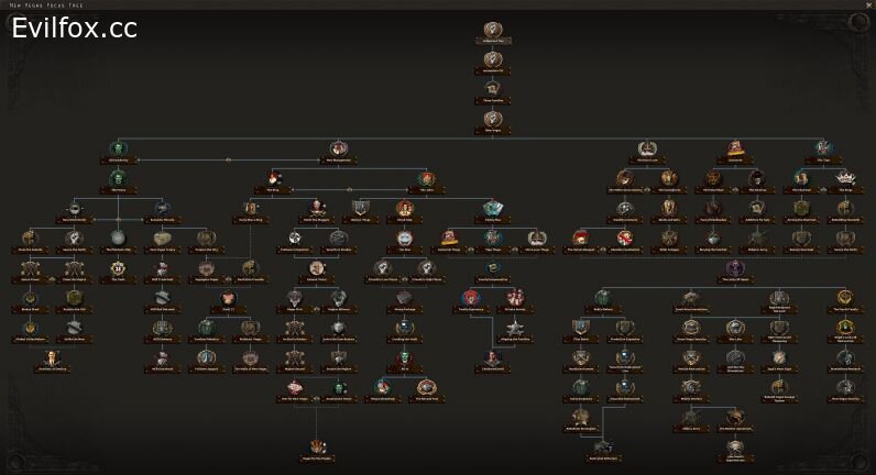 - 3 generic focus trees representing different groups in Fallout: raiders, tribals, and settlers