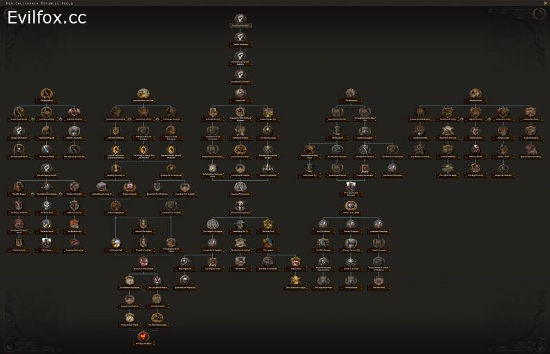 Nations with focus trees: New California Republic, Caesar’s Legion, Western Brotherhood, Washington Brotherhood, Mojave Chapter, Broken Coast, New Vegas, New Reno, Vault City, Desert Rangers, Troll Warren, New Canaan, Heaven’s Gate, Great Khans, Republic of the Ruo Grande, Ejército Mexicano, Chichen Itza, Nueva Aztlán, Free Fighters, Costa Cafeinada, Tierra de los Tzotzil, Tlalocan, Ejército Libertador del Sur, Imperio Mexicano, and Excan Tlahtoloyan; alongside 3 generic trees.