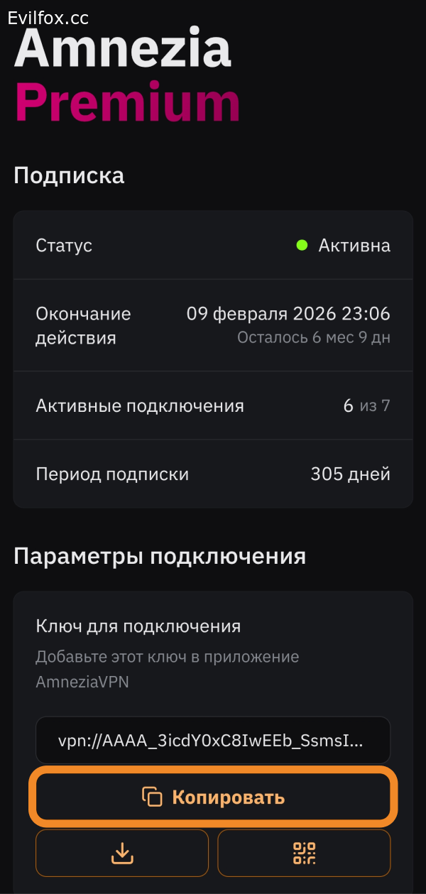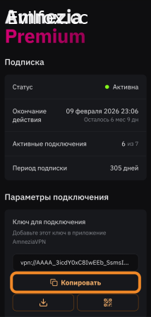 - Зайдите в личный кабинет Amnezia Premium на втором устройстве. Если вы уже авторизованы в нём, в разделе Параметры подключения нажмите кнопку Копировать возле ключа подключения — ключ скопируется в буфер обмена.