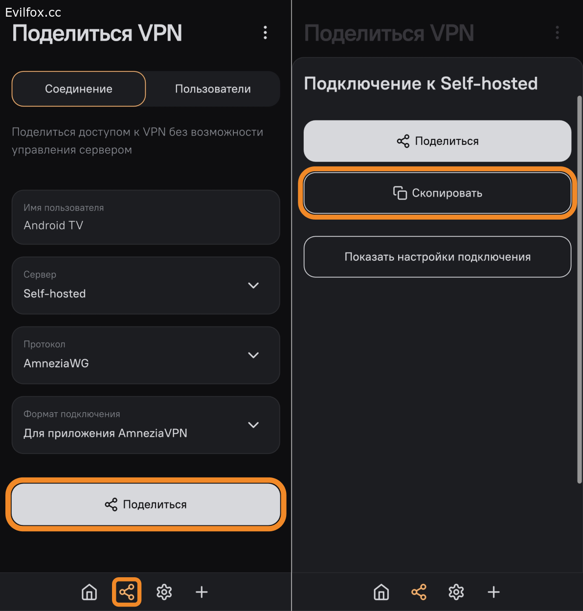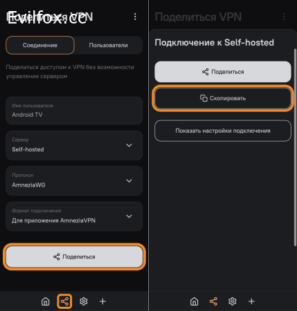 - Откройте приложение AmneziaVPN на втором устройстве, перейдите в раздел Поделиться VPN (вторая иконка в нижней панели приложения) и нажмите кнопку Поделиться.