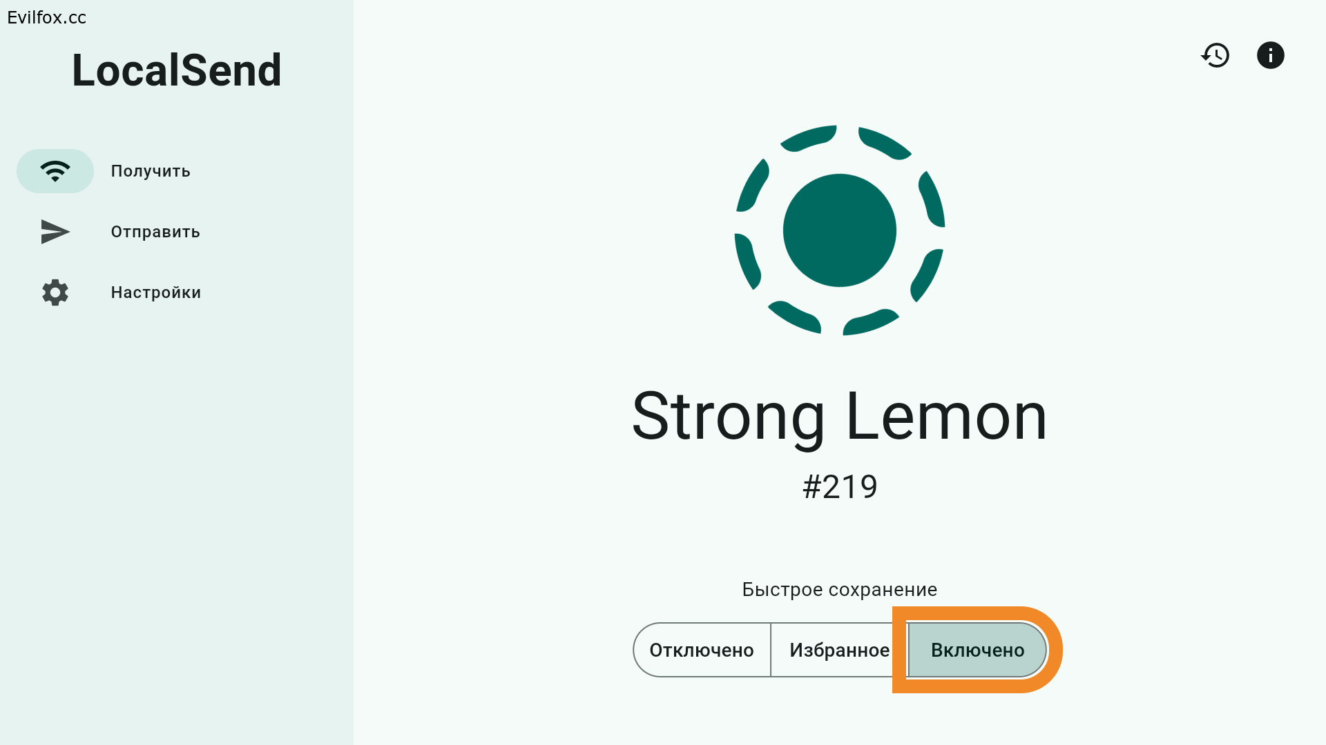 - Откройте приложение LocalSend и нажмите кнопку Включено — приложение готово для получения ключа с другого устройства.