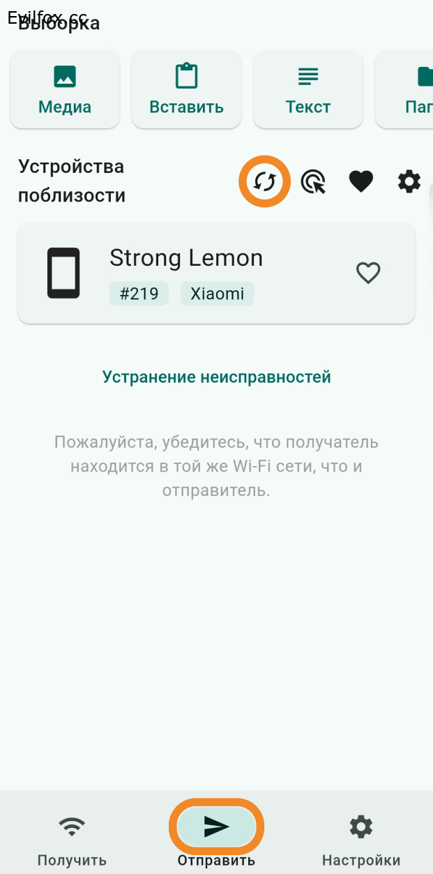 Убедитесь, что случайное имя в приложении LocalSend на Android TV совпадает с именем, которое вы сейчас видите на втором устройстве в списке доступных поблизости.