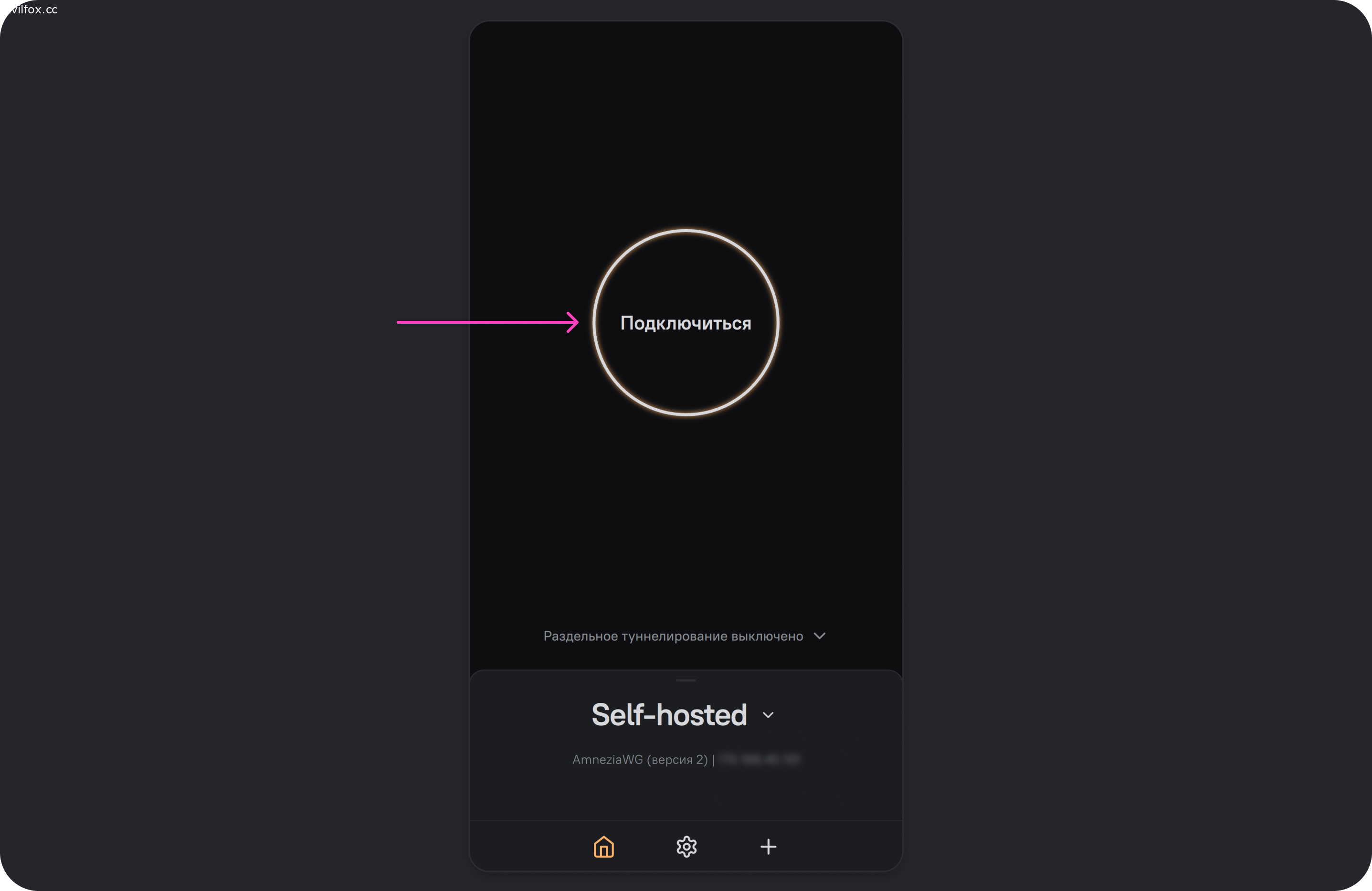 - Откройте приложение AmneziaVPN и нажмите на иконку ➕ (плюс) или на кнопку Приступим, если у вас не было других подключений.
