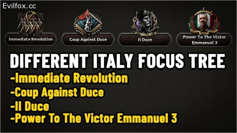 Completed focus trees are Italy, France (it's not as small as it looks, it depends on the ideology you're playing), Iraq, Turkey's Ottoman tree. Focus trees will come to all countries as soon as possible.
