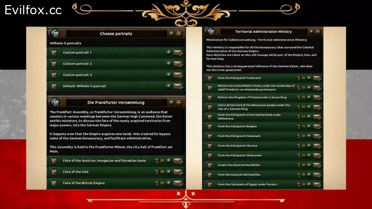 The main objective of this mod is to make a more fun world, for a total conquest with MONARCHIST Germany.