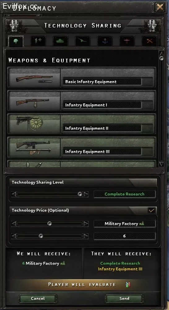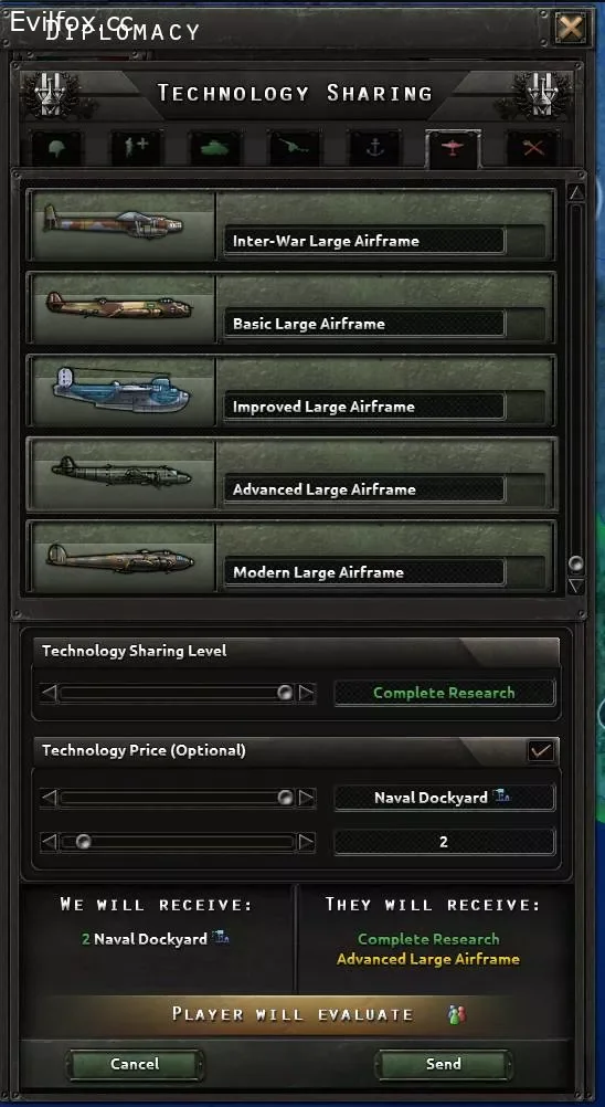 This small mod adds a way to share your researched technologies with other nations, optionally for a price.