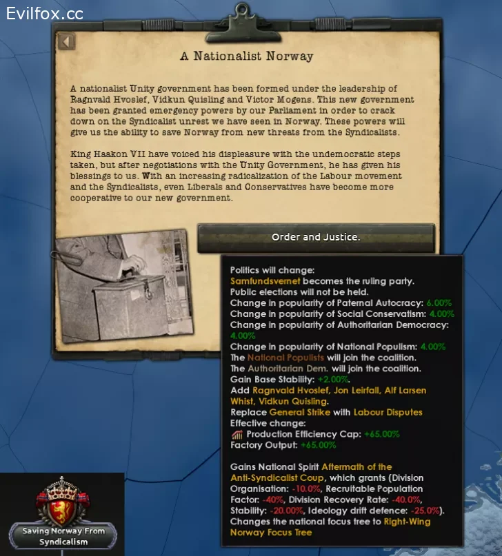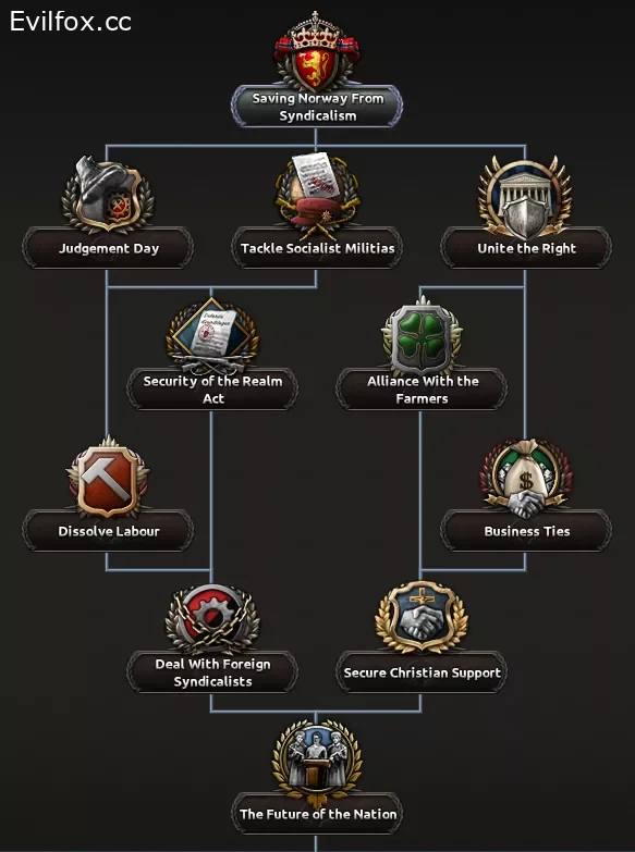 Kaiserreich Norway + is a submod for Kaiserreich focused on expanding the work that has been done on Norway. In this mod, focus has been given to expand the Syndicalist and the anti-Syndicalist focus trees and paths for this little nation.