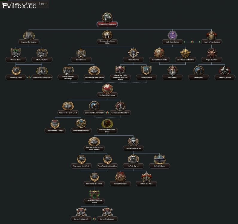 Current Focus Trees: Kingdom of Stormwind [First war only], Blackrock Clan, Bog Beasts, Kingdom of Khaz Modan.
