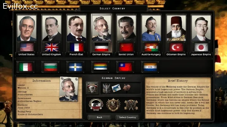 Weltreich-The age of weltpolitik treats the world Central Powers won the Great war. Like real history Russia Soviet Republic won the Russian Civilwar. Georges Valois' fascist party occupied the government through March on Paris. Britain still remains its democratic system but its unstable political situation makes hard to predict the result of '36 general election. Austrio-Hungarian Empire remains precarious Dual Empire system. Franklin Roosevelt overcame infantile paralysis and became President of USA. The First Northern expedition of Kuomintang was executed successfully. But as Second Northern Expedition ended in failure, In the mod there are two chinese governments -North Fengtian Government and South Nanjing Nationalist Government. Also, Itlay became republic and keeping its government after abdication of Vittorio Emanuele III. World situation of 1936 that looks like stable is on the rotten pillars and the treatment of coming Great War will redraw world order.
