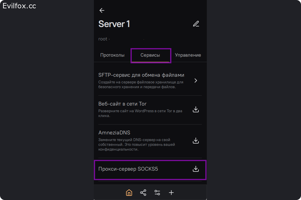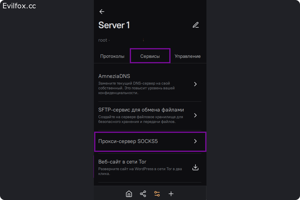 Во вкладке сервисы выберите SOCKS5 прокси-сервер.