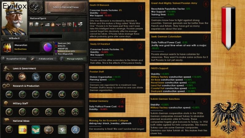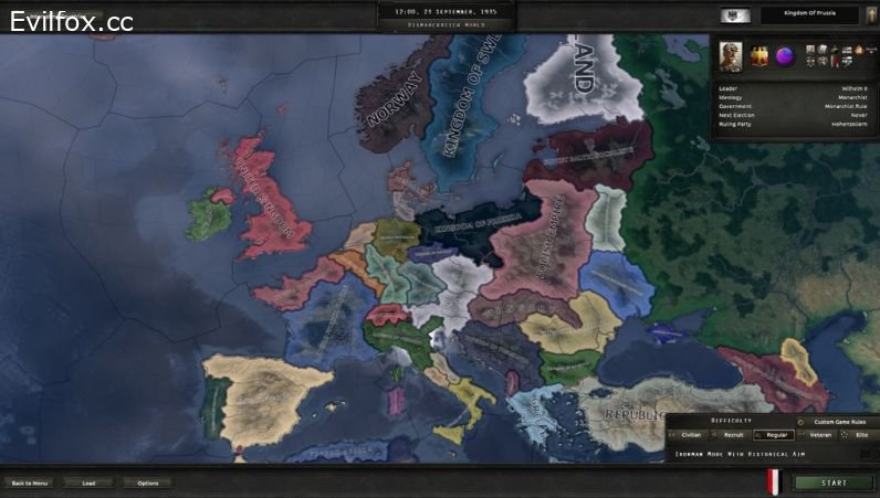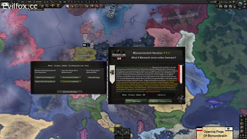 Bismarckreich’s History begins in 1870. In 1870 Prussia fought a war with France, Bismarck went to England to make some diplomatic agreements. As Bismarck finished his work in England and returned back to Prussia a couple of armed British people shot and killed Bismarck. When Prussia learned about this assassination they had declared war on England. England allied themselves with France and Russia while Prussia was allied with Austria, Italy and the Ottoman Empire. The war ended with the defeat of Prussia and its allies. Therefore Germany couldn't be established.