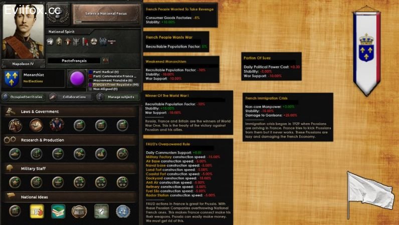 France loss in the war with England increased the Right-wing population in the country. One year after the war a civil war broke out in France. The result of the civil war was the monarchists taking over. The Fascists retreated to Africa while the Monarchists stayed in France. Luxembourg united with Belgium and attacked France to annex Alsace-Lorraine.