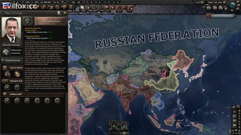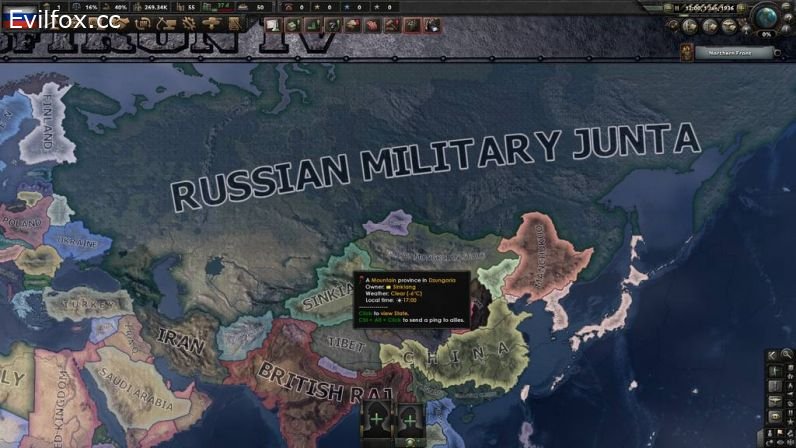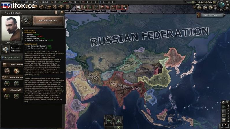 In this alternative history scenario, General Pyotr Wrangel took charge of the White Russian Army during the Russian Civil War far sooner than he did historically, leading them to victory over the Bolshevik Red Army. Since then, he has ruled as the Supreme Leader of Russia at the head of a military junta. To preserve the hard fought peace, he did not attempt to conquer Ukraine, Finland, or any of the other breakaway states. Instead, he formed the faction known as The Pact of Petrograd, whose members include Ukraine, Belarus, Finland, Mongolia, and Tanna Tuva. This eastern bloc is similar to the modern day EU or NATO, where each member state pledges to defend one another and allow close economic cooperation.