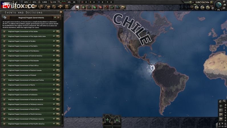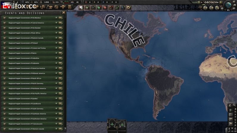 This modification allows an individual to install puppet governments in certain regions of the world. The player must first control the territories corresponding to the certain regional puppet. Afterwards, using the mechanics from La Resistance a collaboration government can be created through decisions. If you don't own La Resistance it will work as well, but it will not change colors and contain the adjective of your nation. I did not want to use cosmetic tags in order to keep the compatibility with other major modifications. The flags I used for many of the puppets are for the time-being and this mod is subject to constant change.