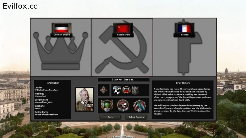 It's 1933, and almost 20 years have past since the Great War is over, although Kaiser Wilhelm II has finally got his Place in the Sun, a great colonial empire and increased his influence in Eastern Europe, the rest of world does not seem to be going as well as Germany. The fascists, ruled by Napoleon VI, seized the power in France, a communist revolution is about to break out in Russia, and in Austria-Hungary, the democratic plan, called "the United States of Great Austria", that would save Austria from collapse, was refused by Kaiser Karl, the separatism is constantly increasing.