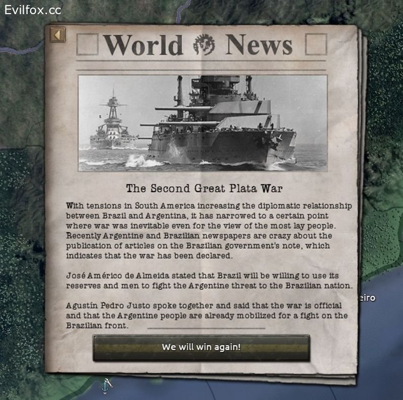 In 1923, during the Uruguayan election the Colorado Party emerged victorious, but Argentina accused Brazil of having manipulated the elections in their favor, several demonstrations against the Colorado government took over the country. In the silver basin, a Brazilian ship loaded with coffee was passing through Argentine waters and, because of tensions, the ship was hit by Argentine submarines without warning, this on September 7, 'Independence Day of Brazil'. With these events, Brazil was taken by a spirit of war and fury against the Argentines, pro-war demonstrations circulated in the main capitals causing the government to be pressured to declare war. After struggles and many deaths, the Brazilians emerged victorious in the battle of Rósario, opening doors for a breakthrough in the Plate River, which forced the Argentine government to sign a peace agreement.