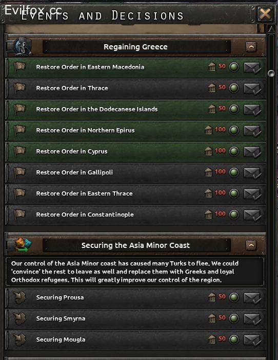While Greece has one of the more detailed focus trees in Kaiserreich and certainly in the Balkans, there isn't really a reward for 'winning', beating the Bulgarians and Ottomans and fulfilling the Megali idea. However, I didn't want to make a meme mod where you can get cores on territory which haven't had a Greek population for centuries. This mod allows you to resurrect the Byzantine empire, but mostly in name. You can get cores on the Asia Minor coast, as there was still a considerable Greek minority in this area in KR (the OTL population exchanges haven't taken place).