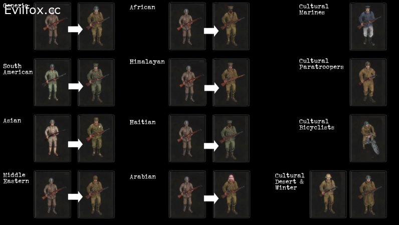 Included in this mod are uniforms for the base generic game models (African, Asian, European, Middle Eastern, South American) plus a few extra specific very generic nations (Arabian nations, Himalayan nations).