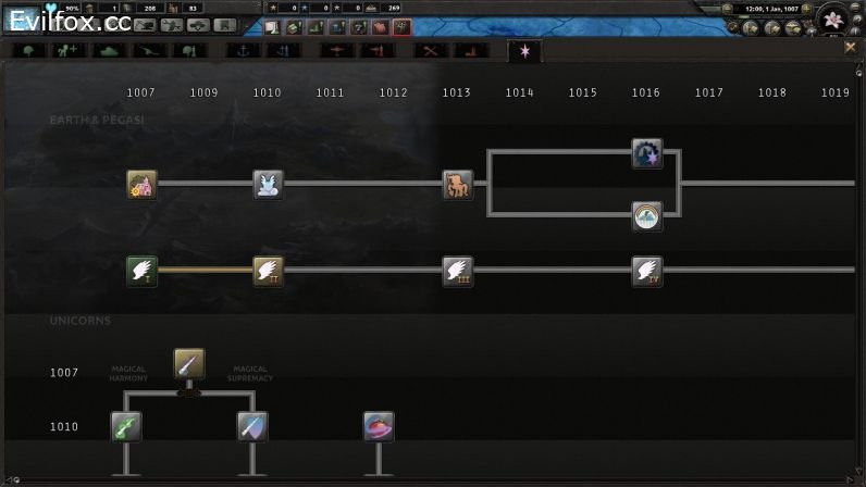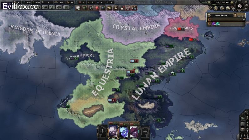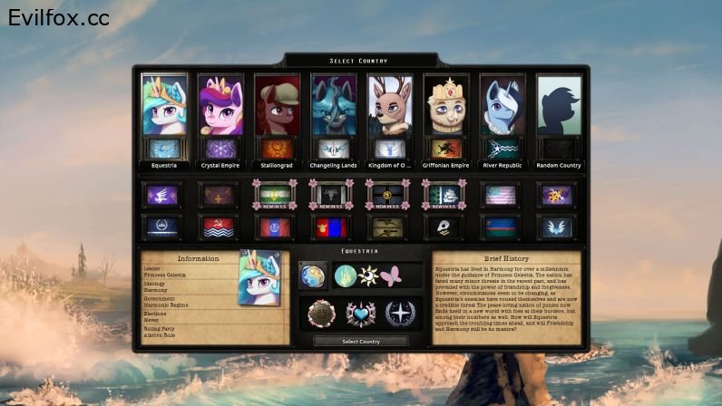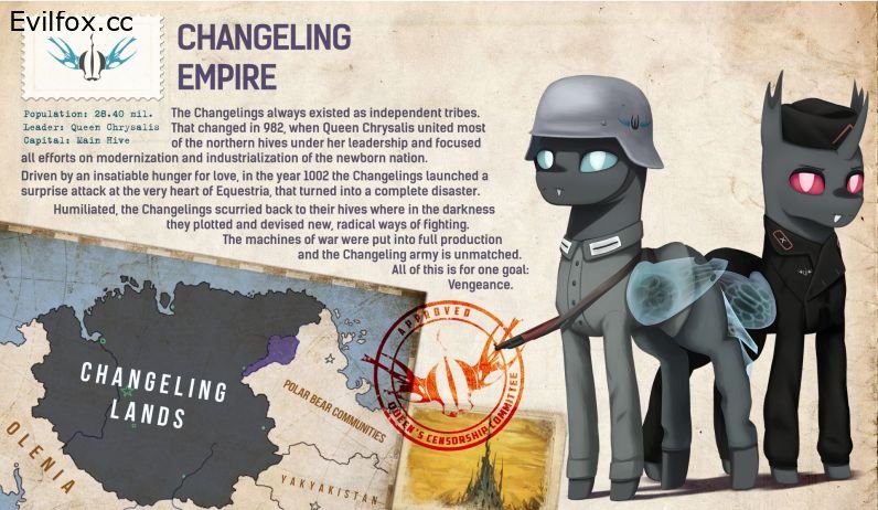 Equestria at War is a mod that tries to recreate the fantasy world of Equestria from My Little Pony franchise in a slightly darker setting with industrialization, corruption and political disagreements. The scenario focuses on global confrontation between Changelings and Equestria.